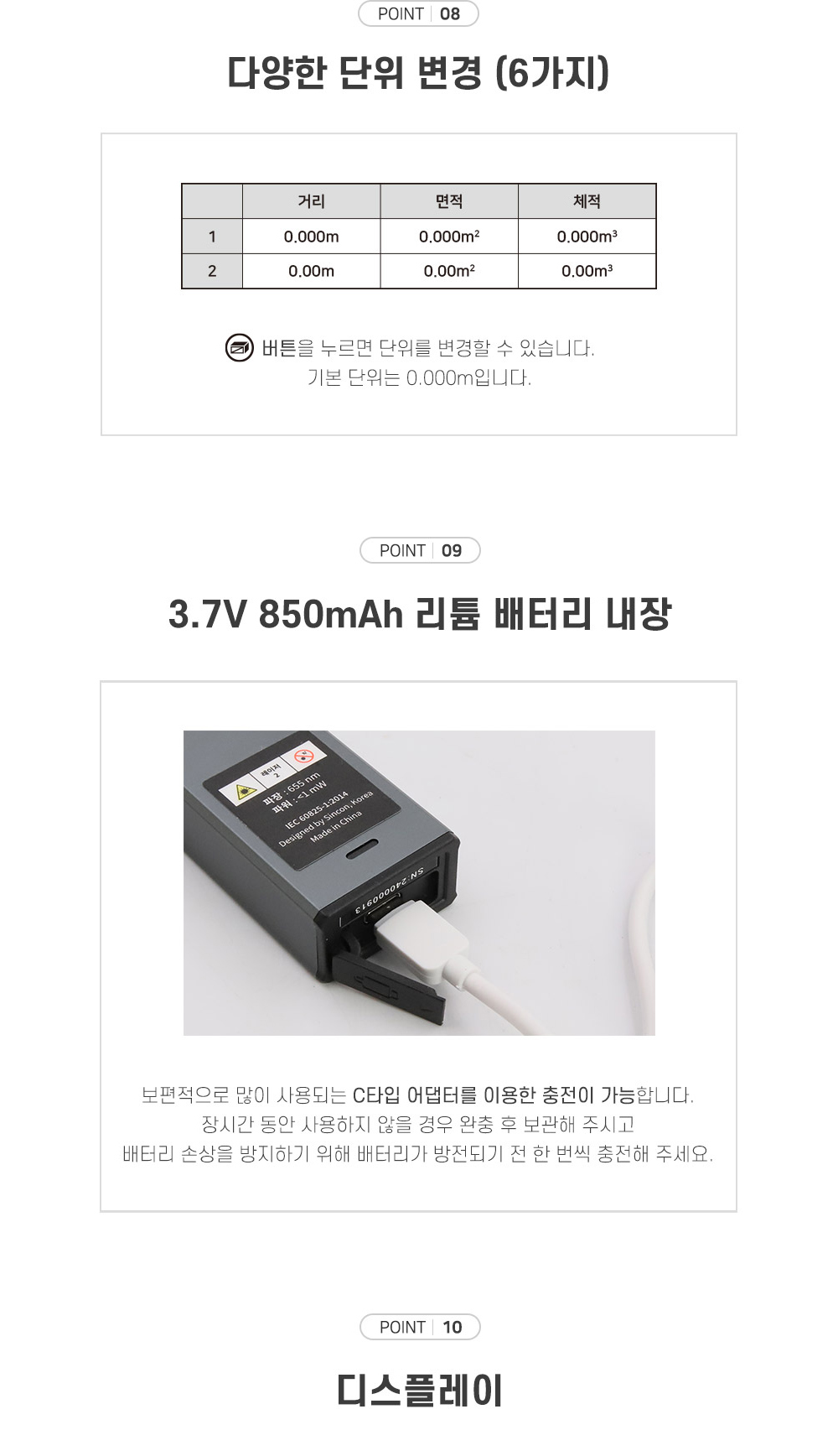 제품의 사양, 기능, 사용법 등을 자세히 보여주는 이미지들입니다